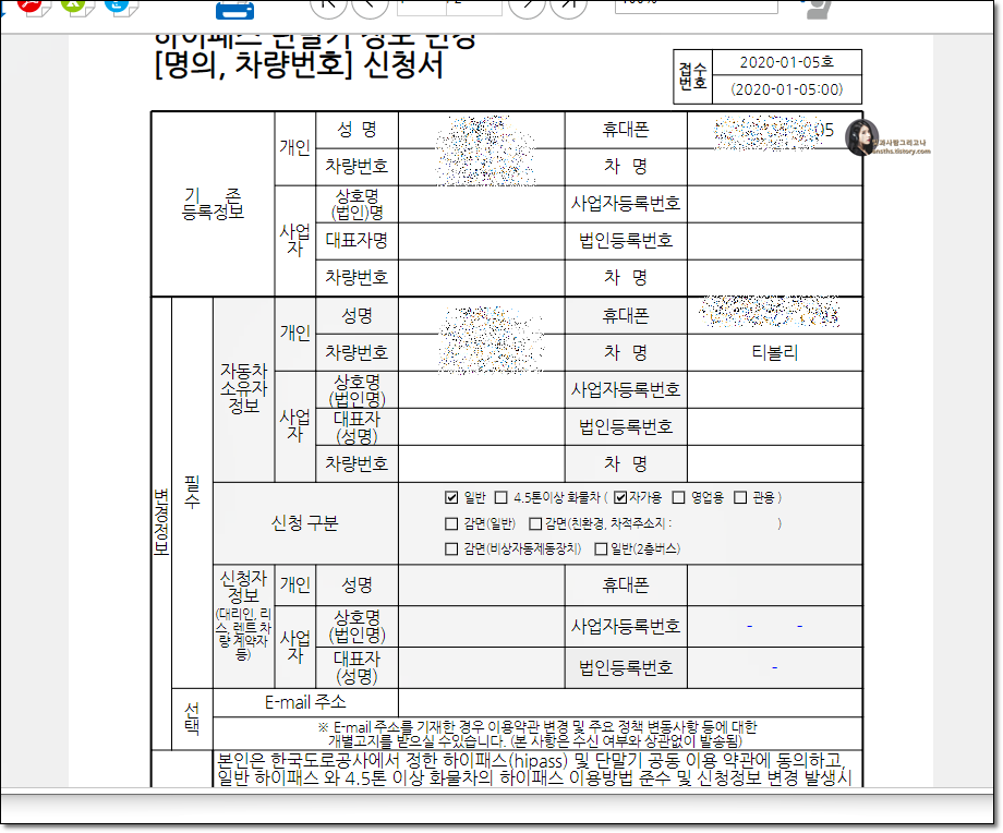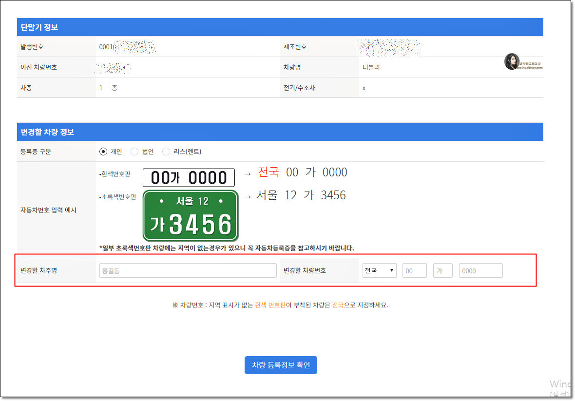 ▲ 본이 아니게 이전 차주분의 성함을 알게되네요 기존 차주분의 정보가 등록되어 있으며 변경할 정보를 등록합니다.